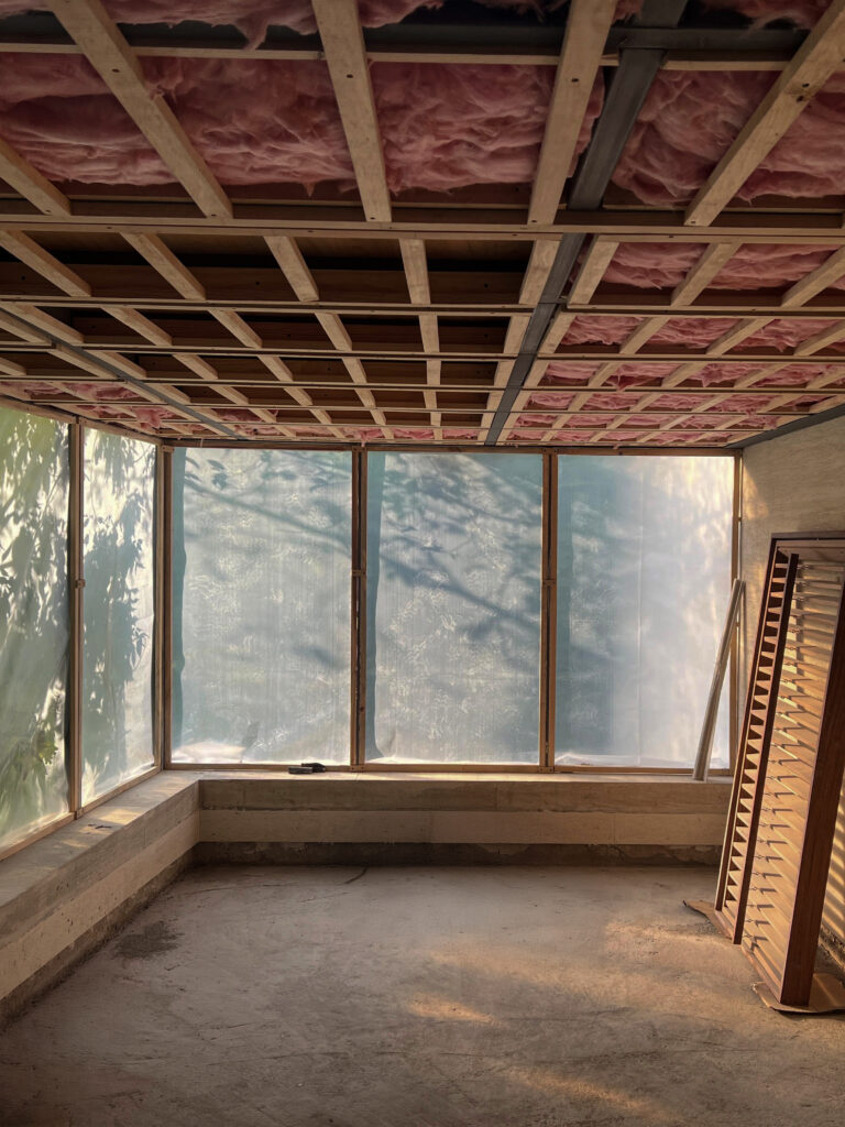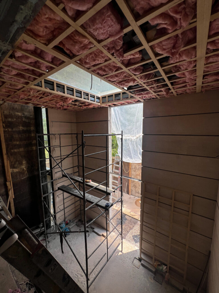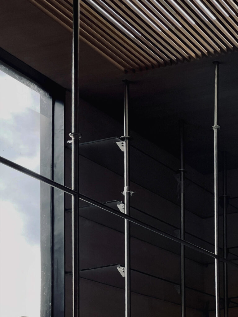 El sistema se resolvió con tubos de acero galvanizado empotrados en placas de 5/8” y anclados al techo mediante PTRs de 4×4 pulgadas. Los libreros, modulados desde la fase estructural, incorporan cejas tipo “C” para sostener vidrio y ménsulas inspiradas en la sección de una pagoda.