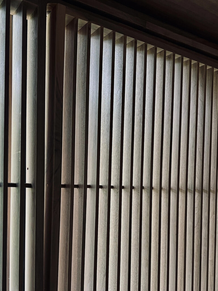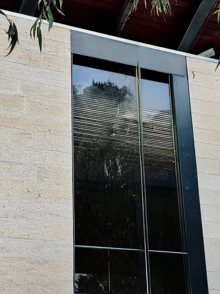 Una tira de iluminación horizontal traza una línea perfecta en los cantos de los cristales. Entre cada módulo, placas de laja Moka Rosal eliminan líneas verticales, reforzando los tubos como único elemento vertical.