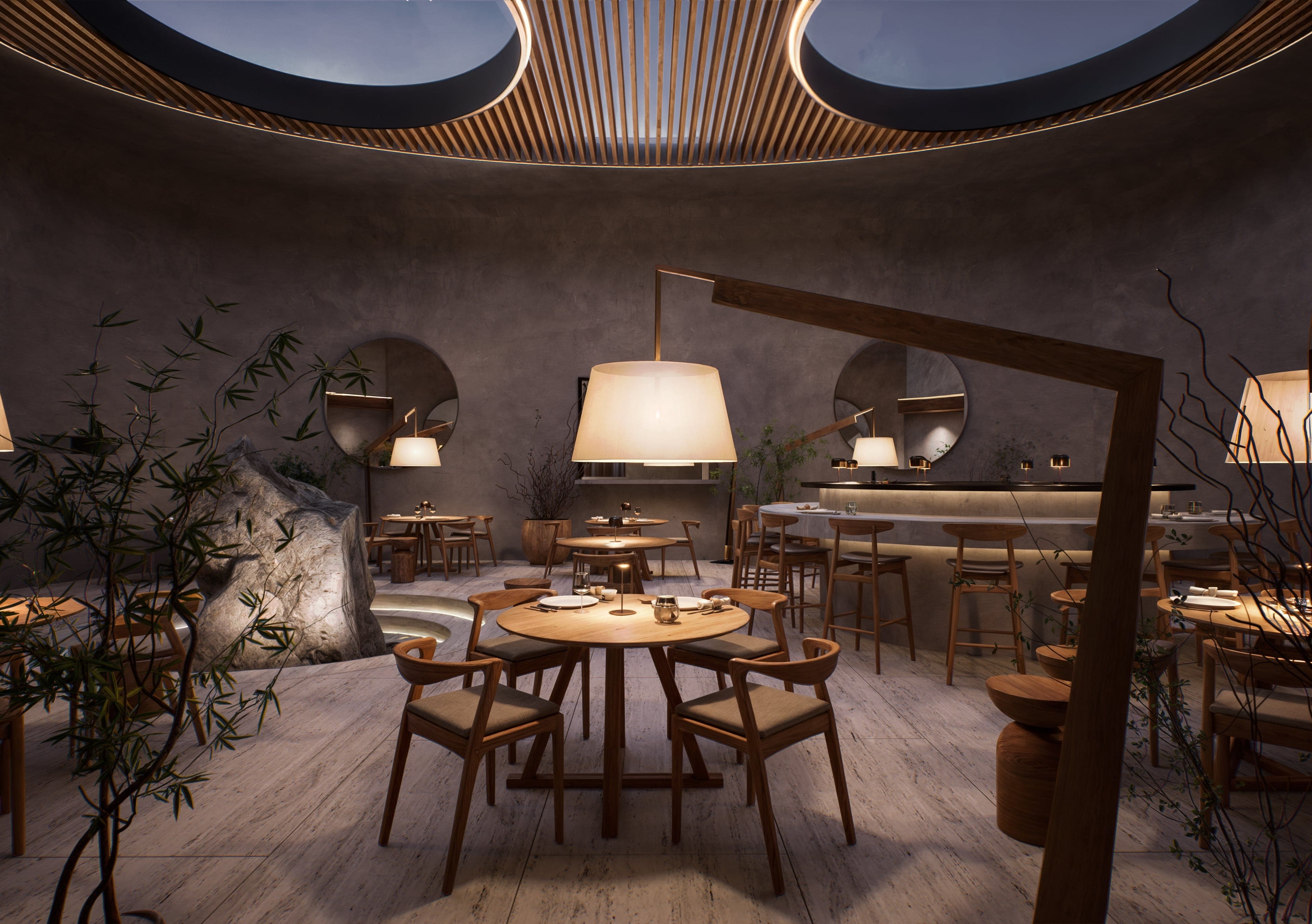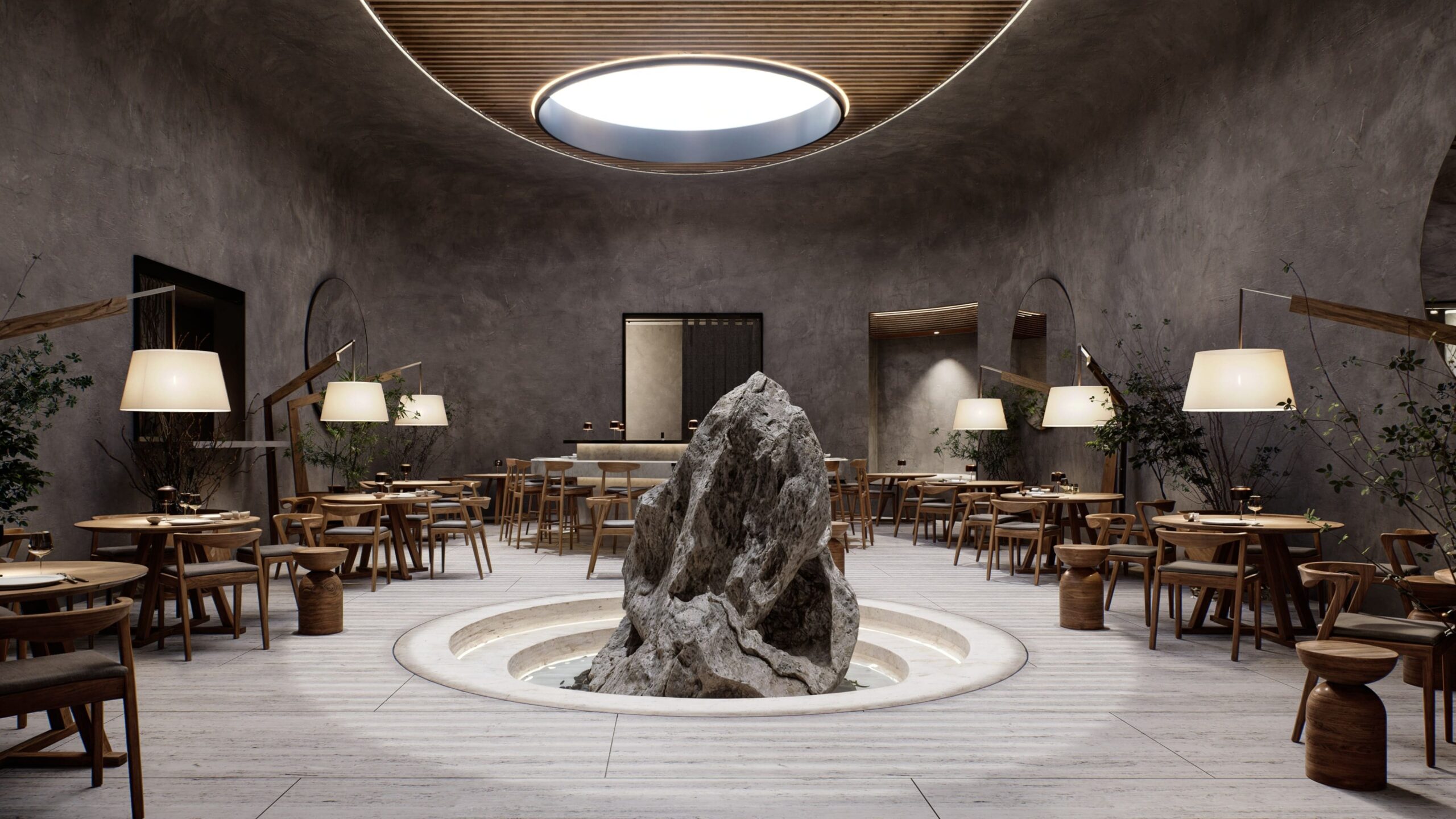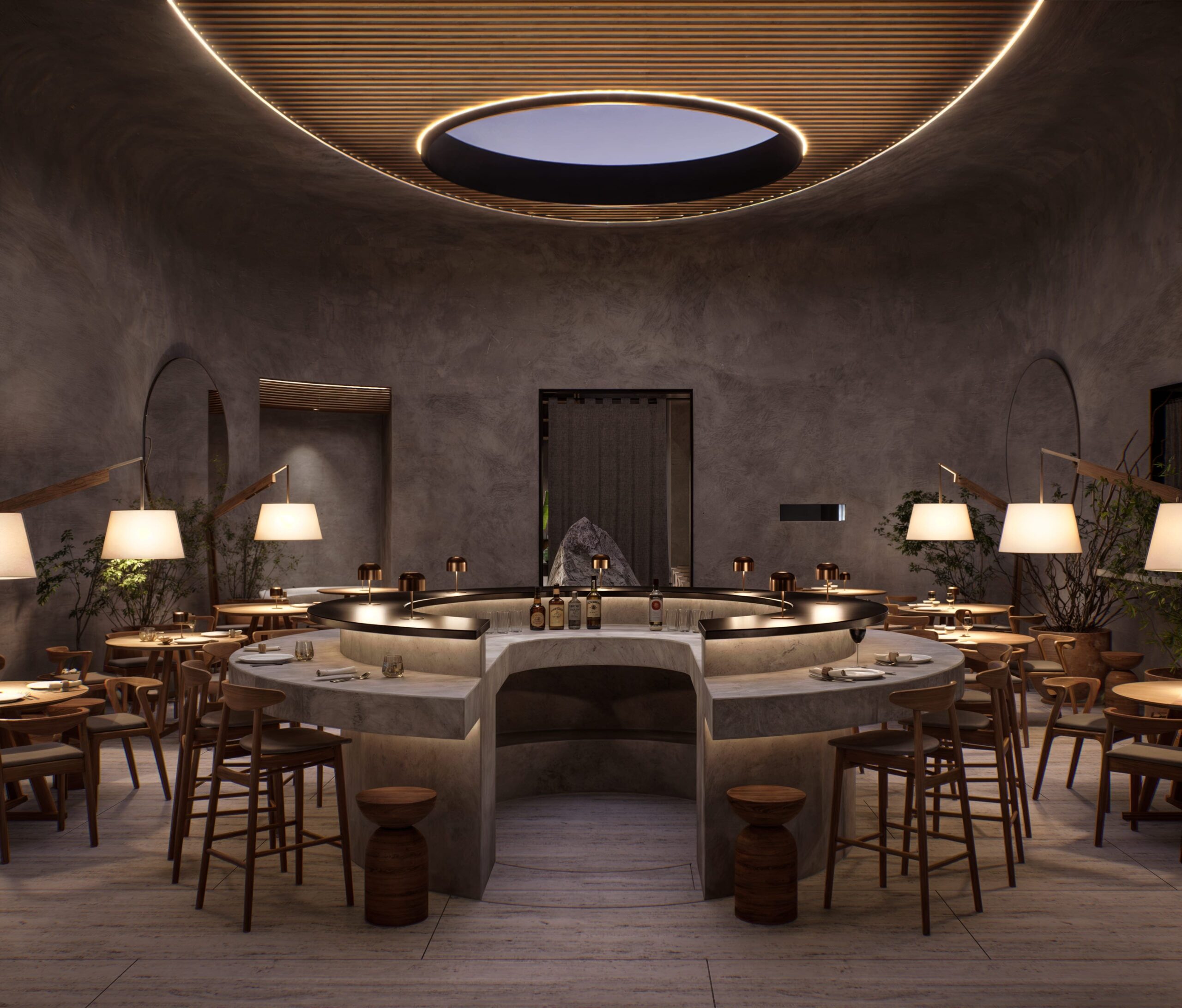 El restaurante cuenta con una secuencia de espacios conectados, siendo el corazón del diseño un salón principal con una apertura ovalada de 12 x 6 metros, enmarcando una piedra monolítica de casi 3 metros de altura. Al fondo del salón, una barra circular reflejada en el techo completa la estructura.