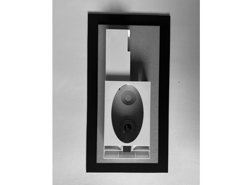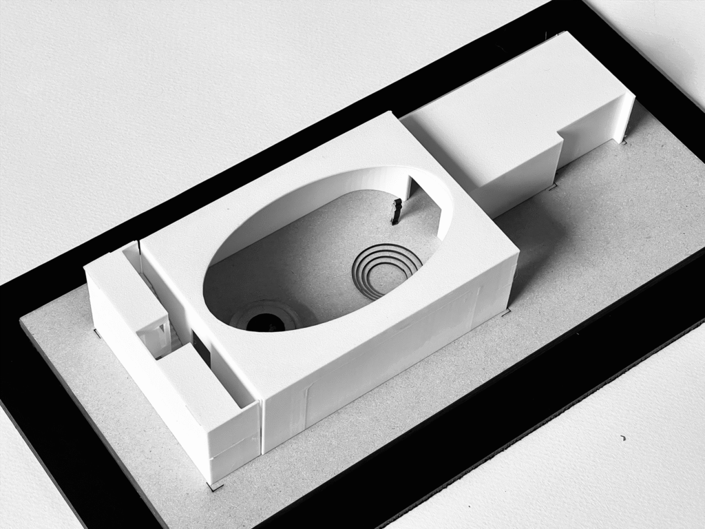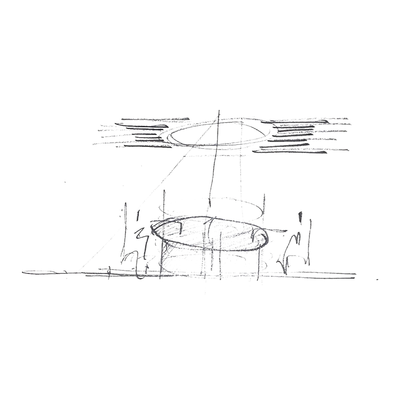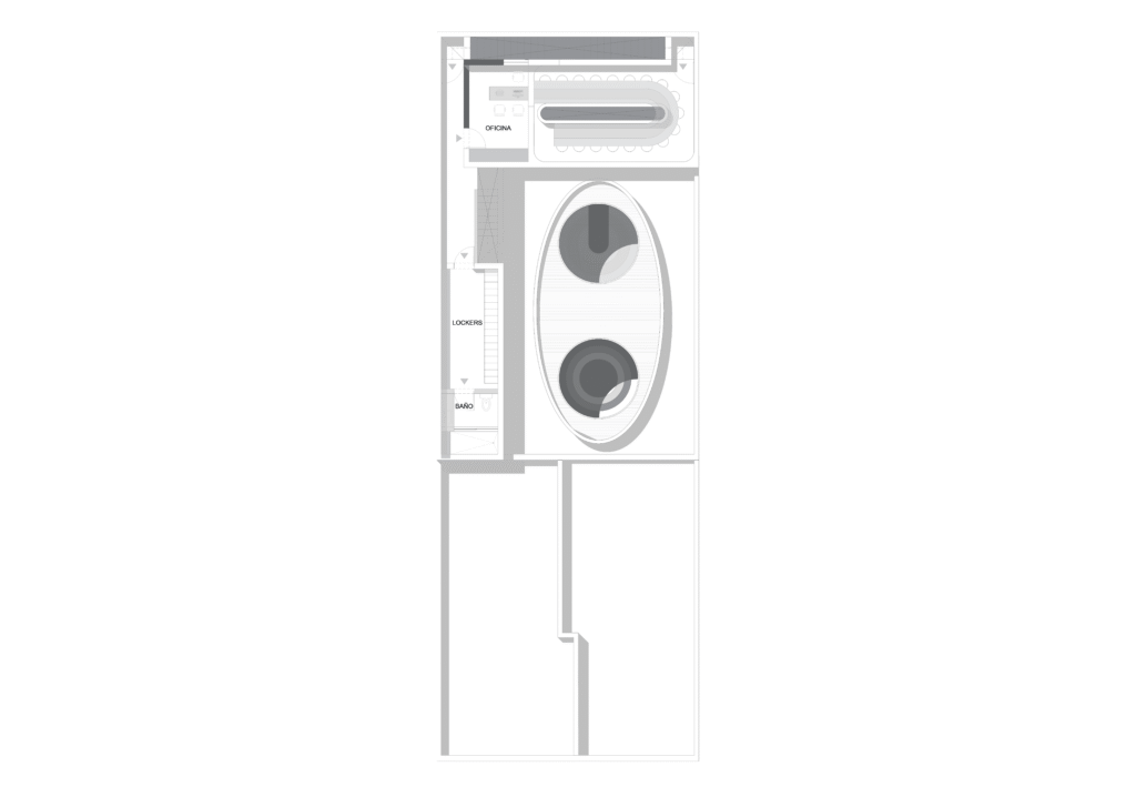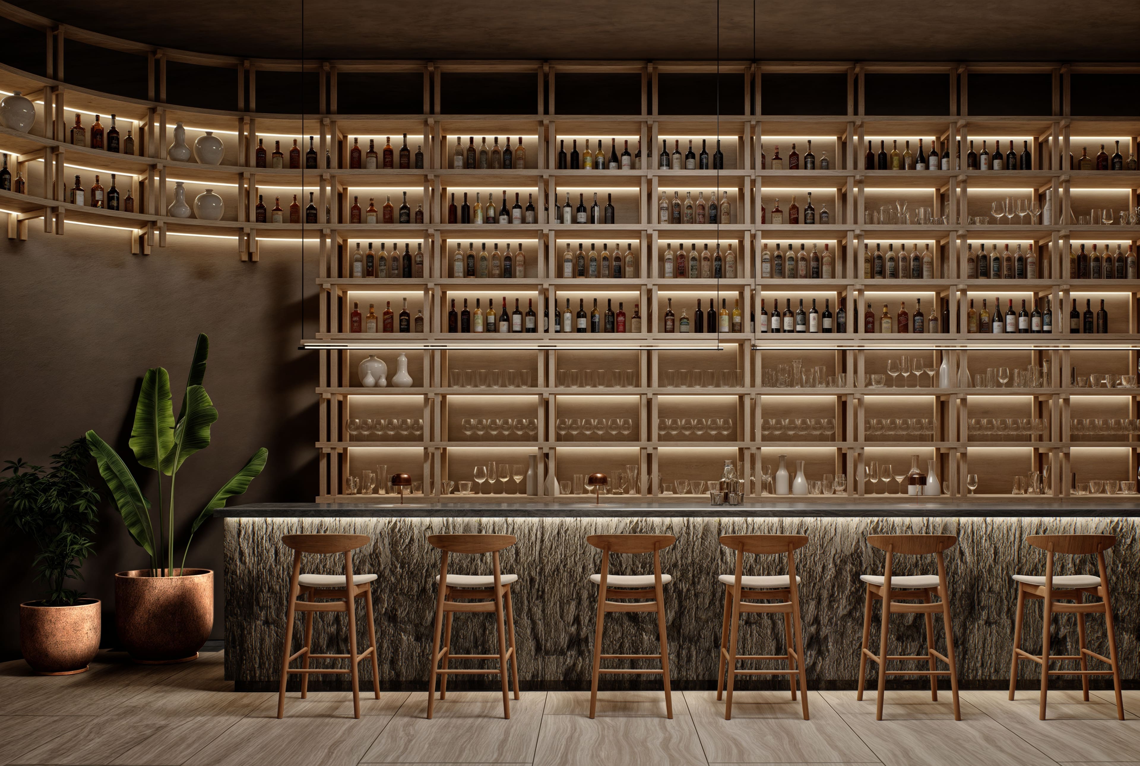 El restaurante cuenta con una secuencia de espacios conectados, siendo el corazón del diseño un salón principal con una apertura ovalada de 12 x 6 metros, enmarcando una piedra monolítica de casi 3 metros de altura. Al fondo del salón, una barra circular reflejada en el techo completa la estructura.