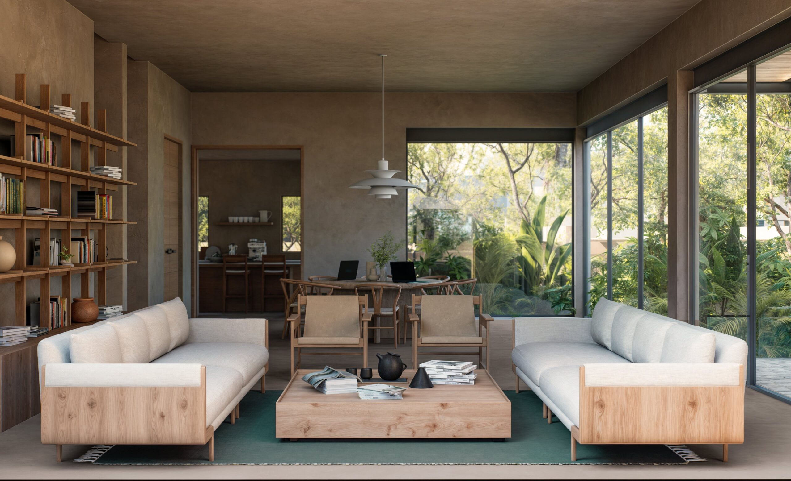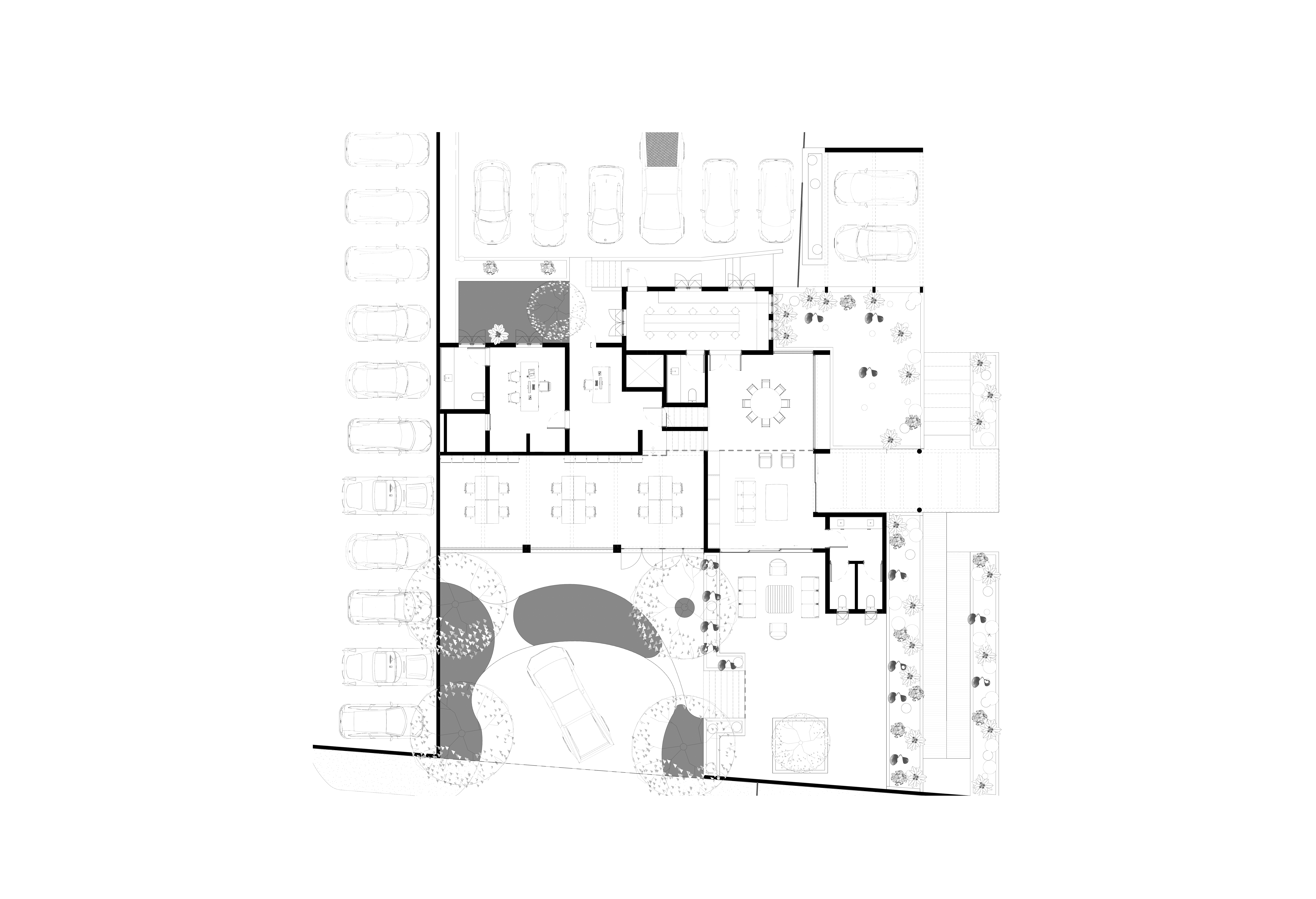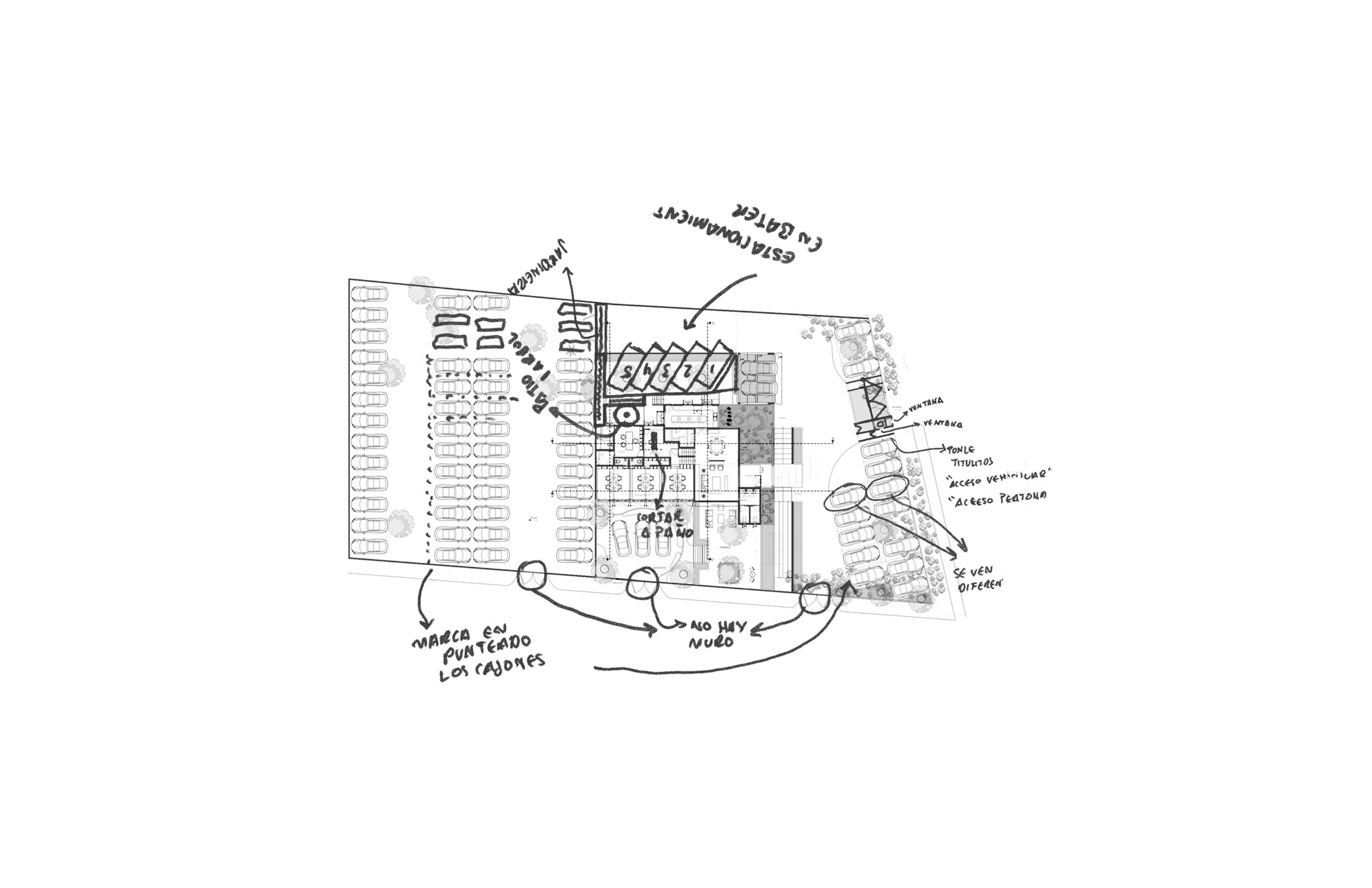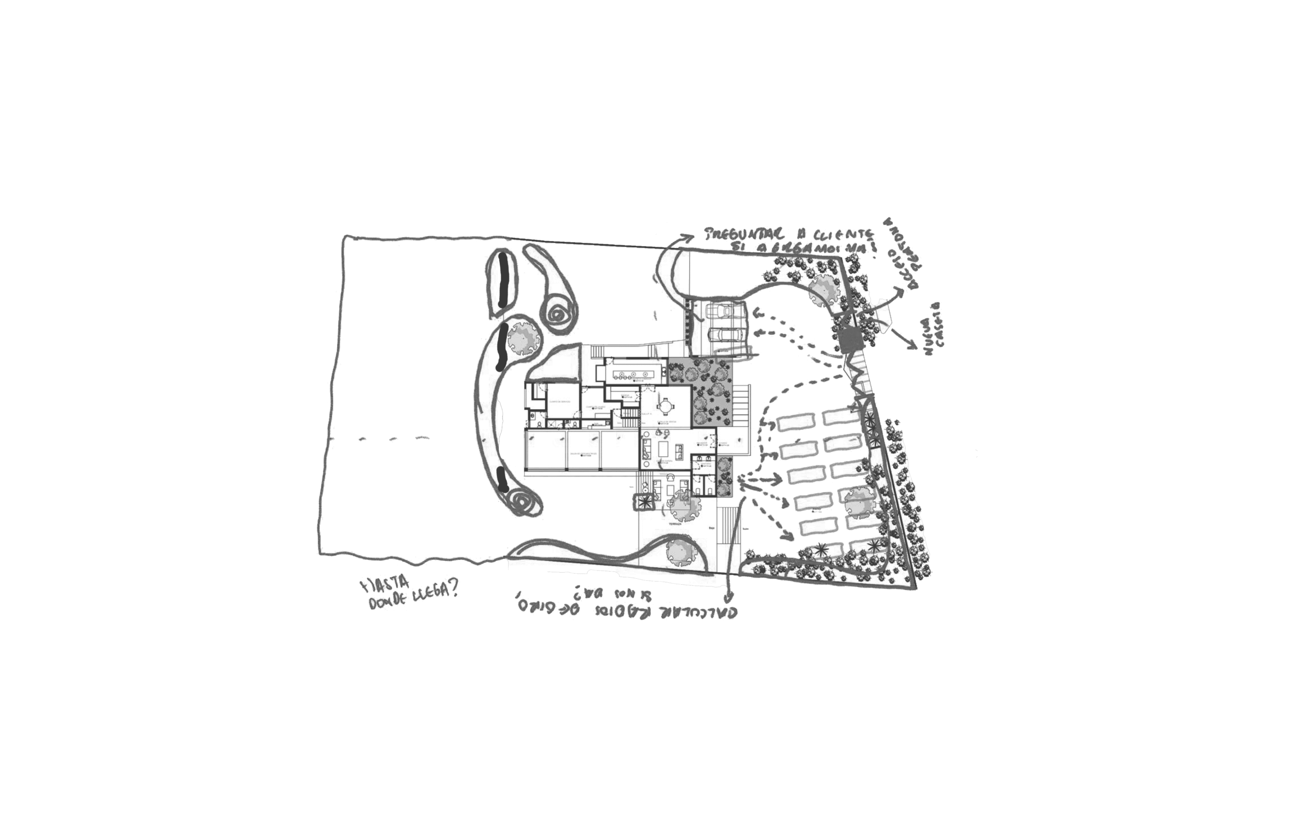 Uno de los grandes retos fue adaptar un programa doméstico a las necesidades de oficina: trabajo colaborativo, oficinas privadas, recepción y almacenamiento. El plan maestro contempla una ampliación frontal de automóviles y un estacionamiento trasero, con la casa —elevada sobre un basamento forrado en piedra— como pieza central del predio.