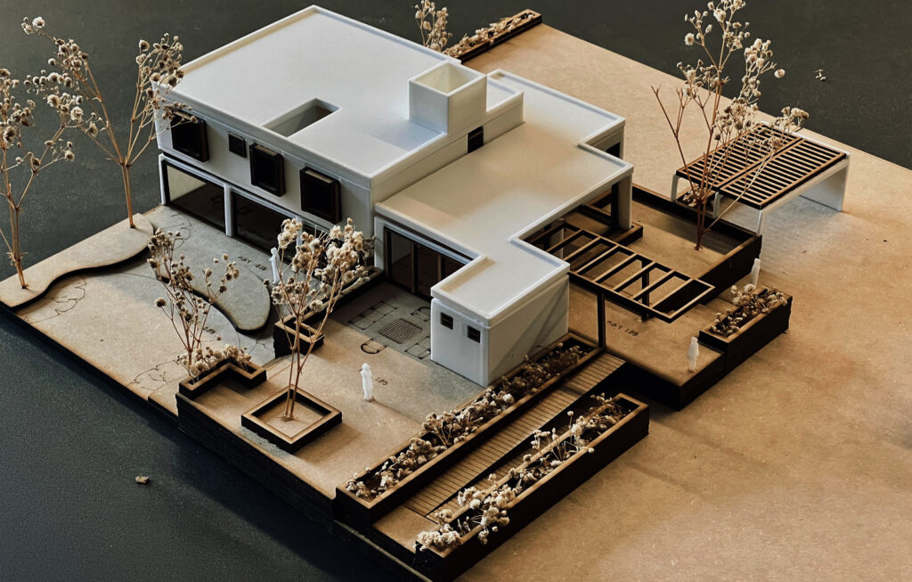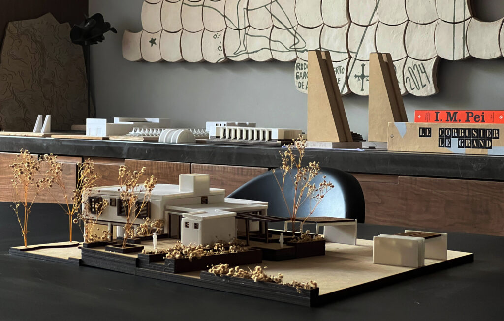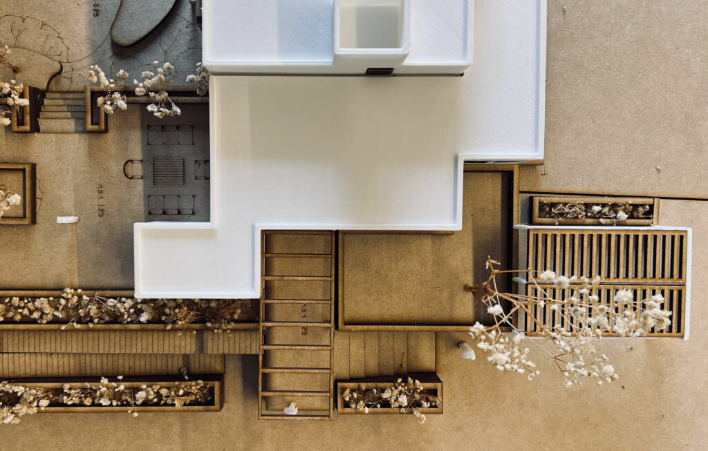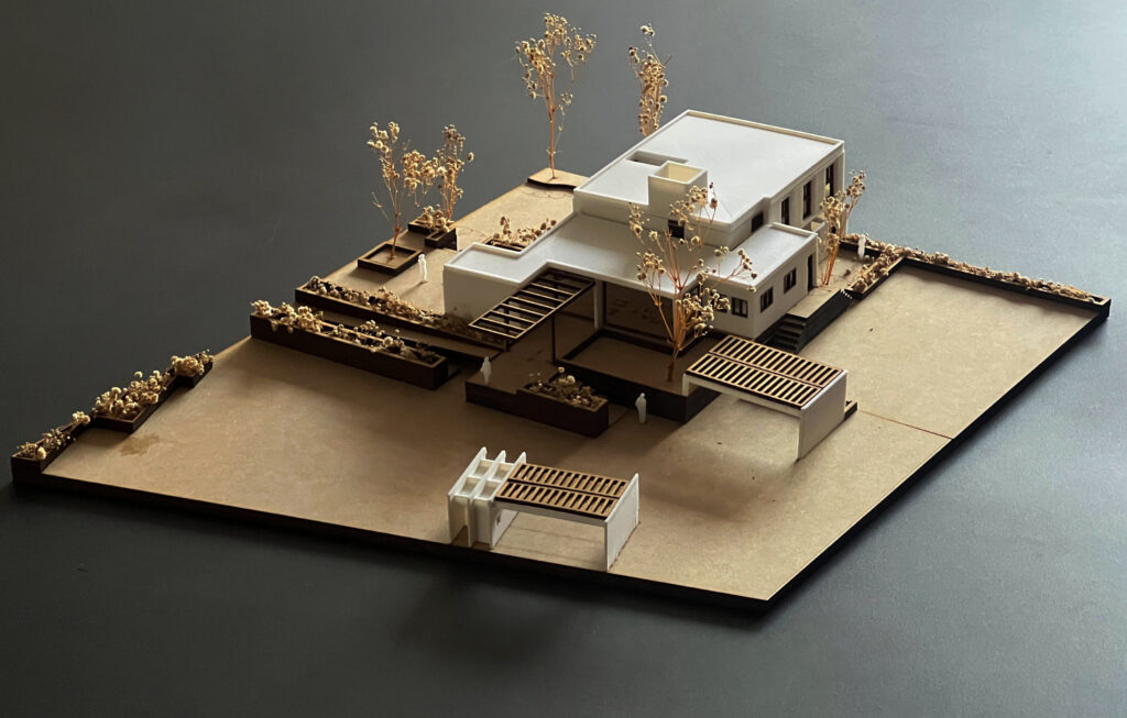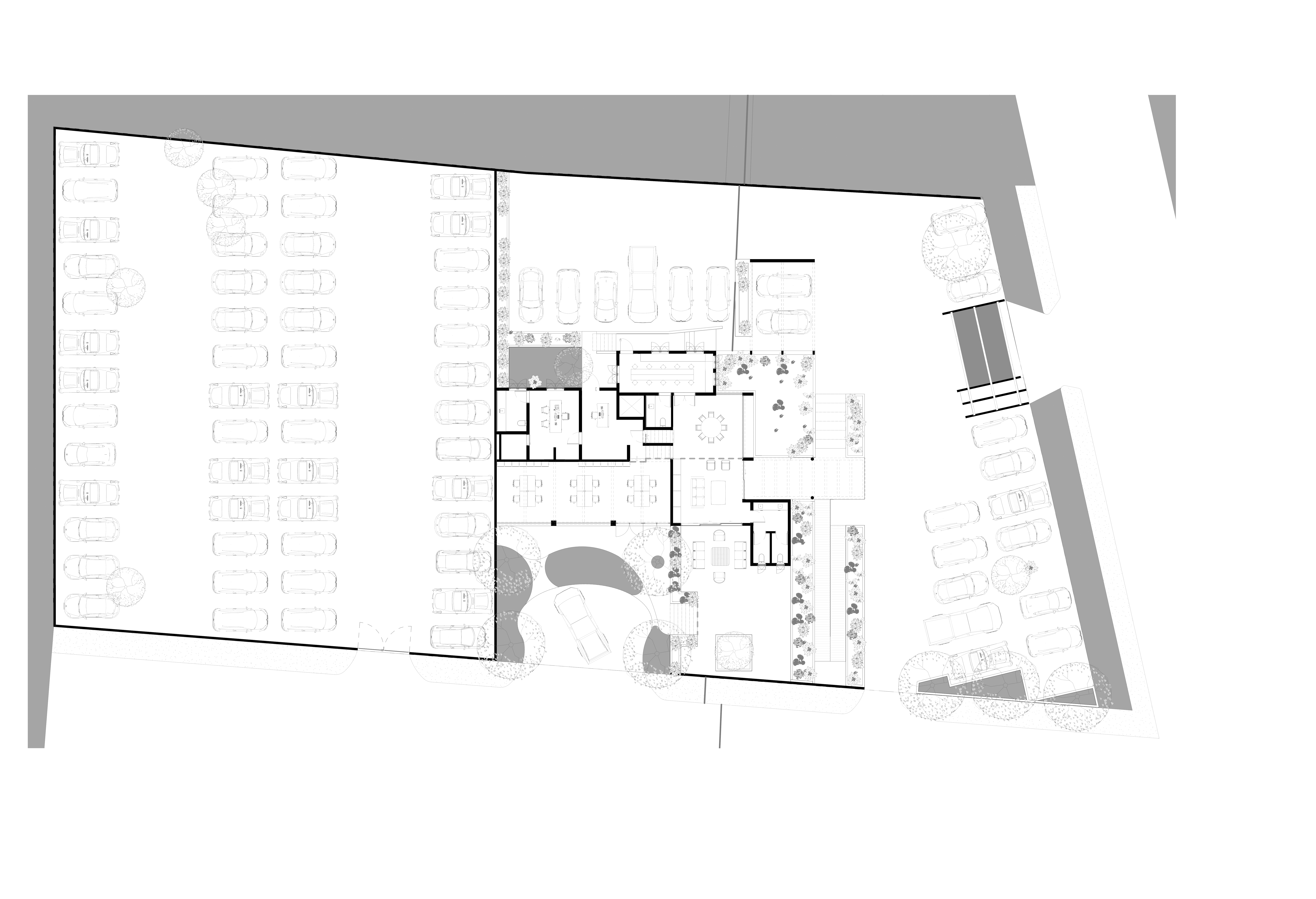 Uno de los grandes retos fue adaptar un programa doméstico a las necesidades de oficina: trabajo colaborativo, oficinas privadas, recepción y almacenamiento. El plan maestro contempla una ampliación frontal de automóviles y un estacionamiento trasero, con la casa —elevada sobre un basamento forrado en piedra— como pieza central del predio.