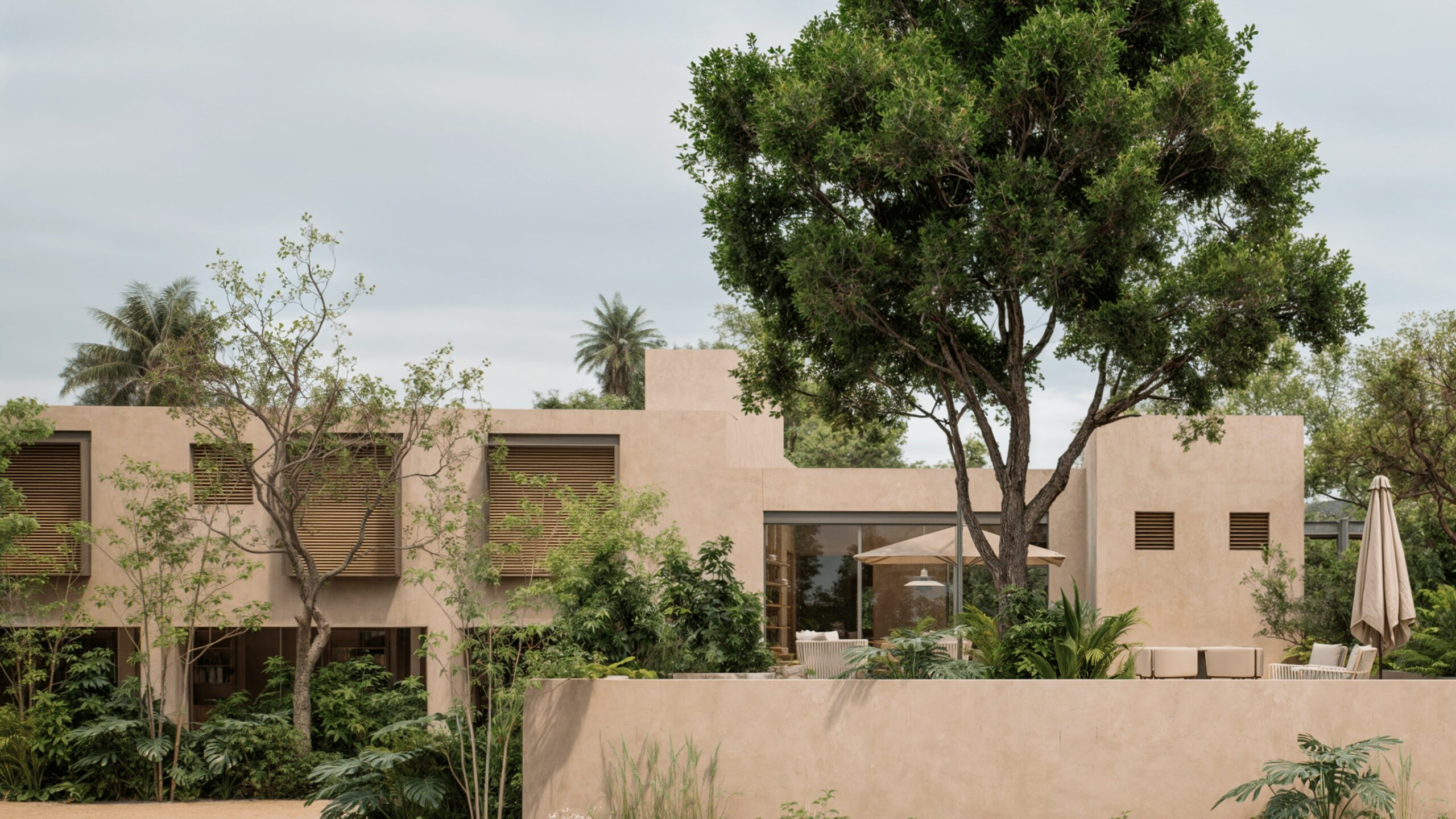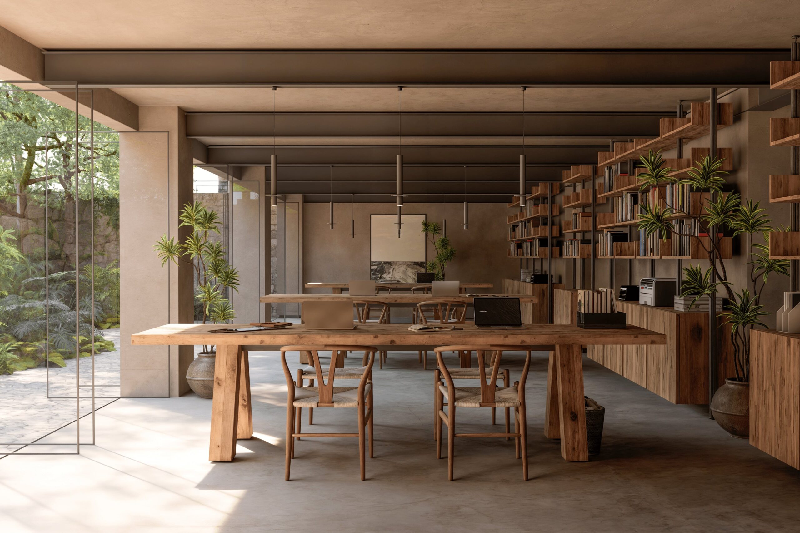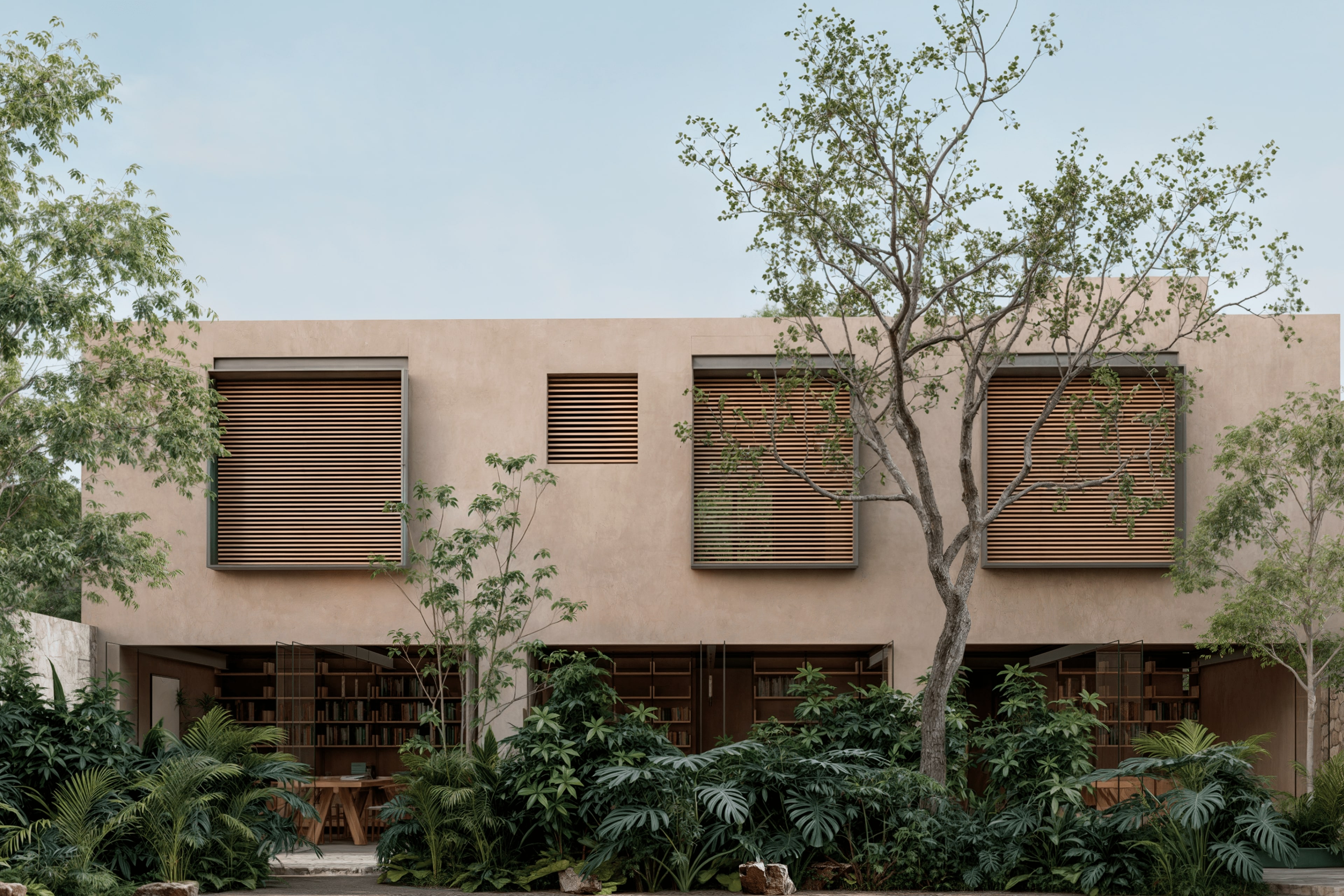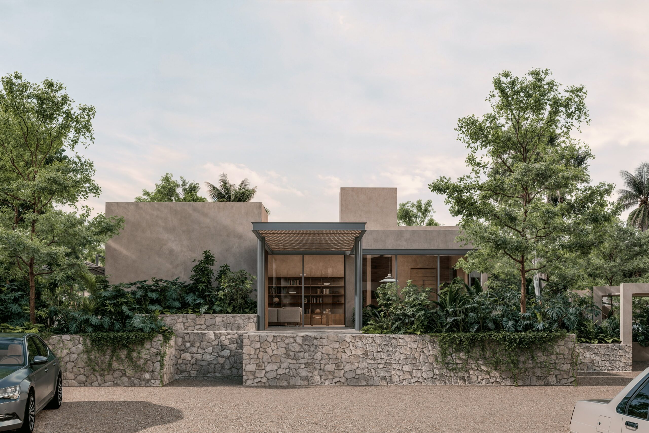 El basamento acentúa el peso visual de la casa y se rodea de vegetación de distinas alturas, organizadas de tal forma que ofrece sombra, confort climático y vistas verdes en ambos sentidos. Materiales como el chukum y shutter móviles refuerzan el lenguaje austero tropical. El proyecto logra algo interesante: una oficina que no parece oficinas, sino una casa con una nueva vida.