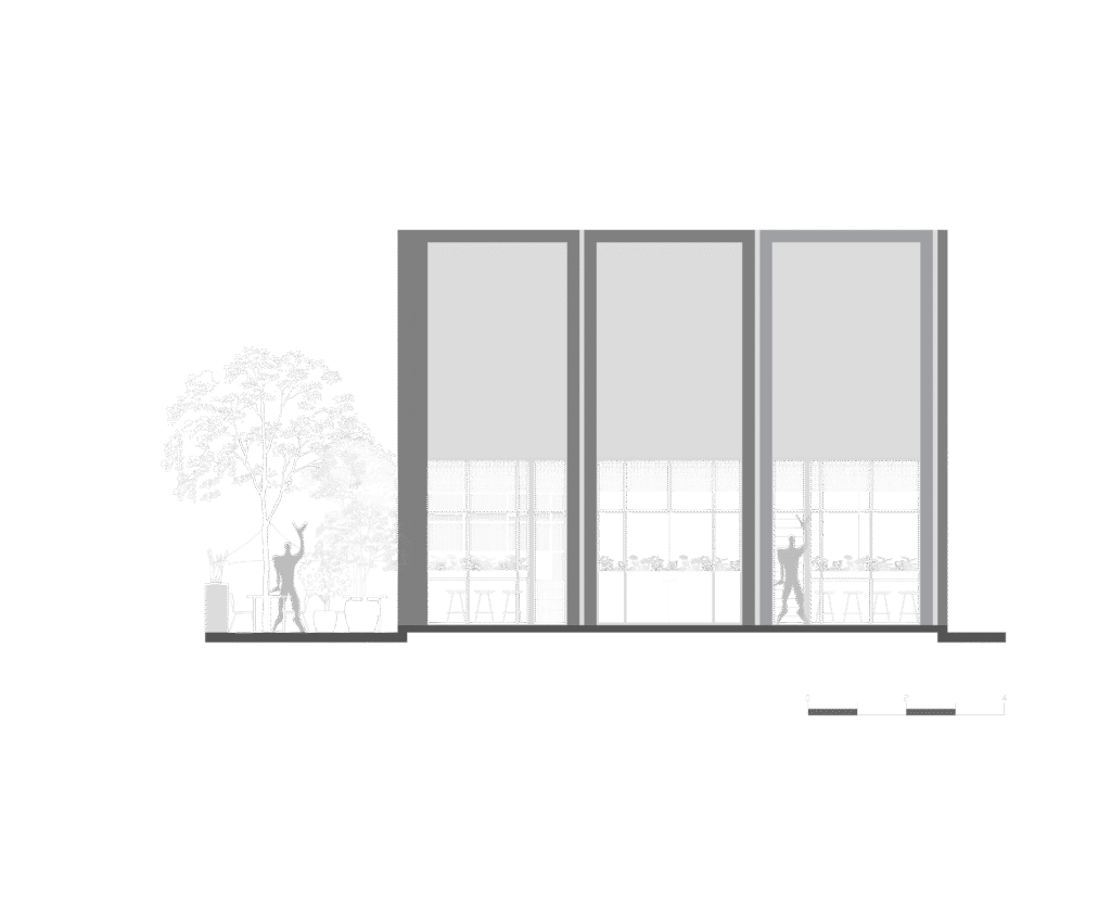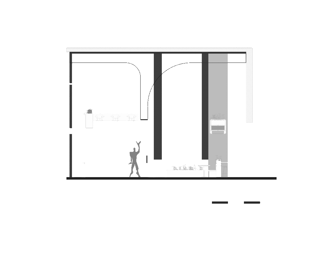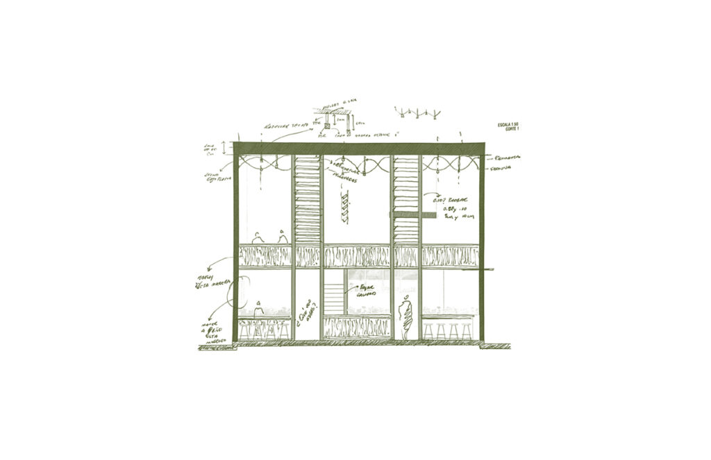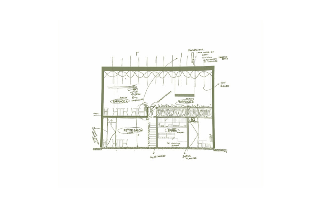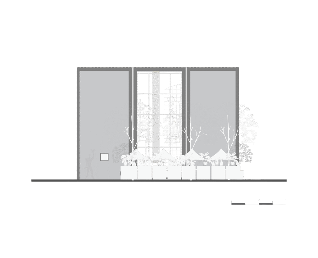 Al ingresar, te reciben cuatro cartelas monolíticas que atraviesan un entrepiso de doble altura, enmarcadas por jardineras colgantes que definen la “Antesala”, un espacio de transición. Al atrevesar|estas cartelas, se accede al “Gran Salón”, un espacio teatral de doble altura con telas verdes que crean un vórtice visual, guiando la mirada hacia un mural monumental y un gran ventanal.