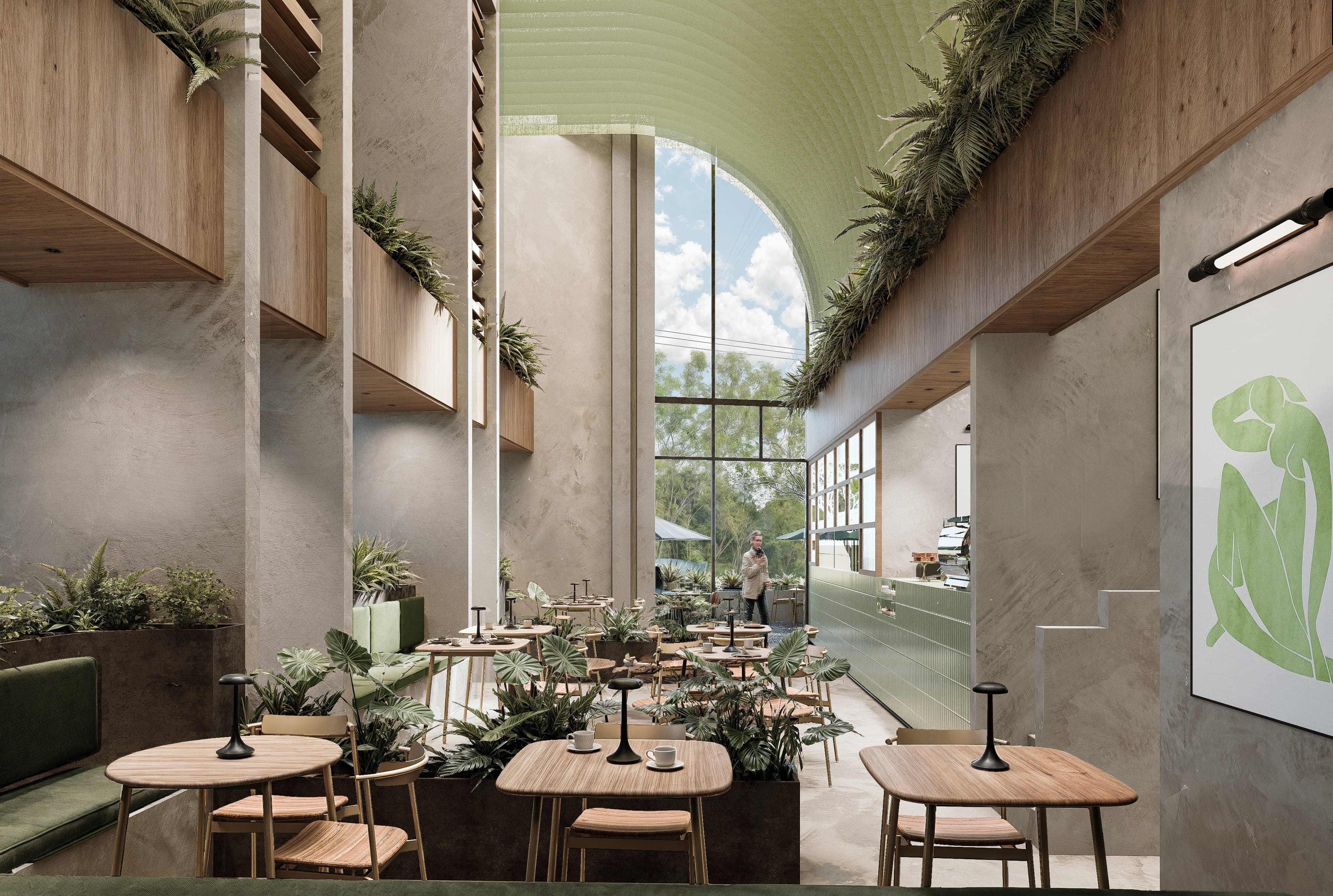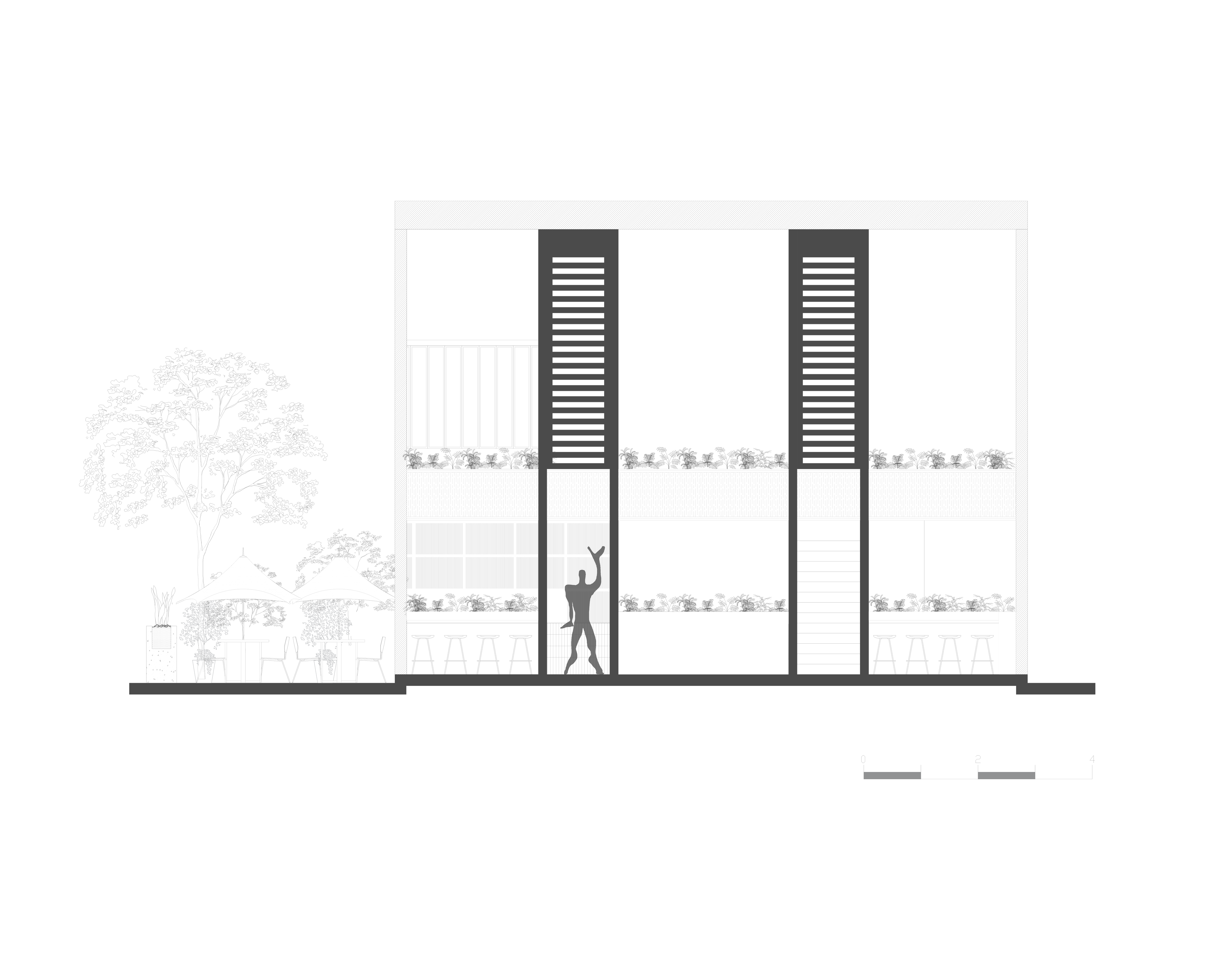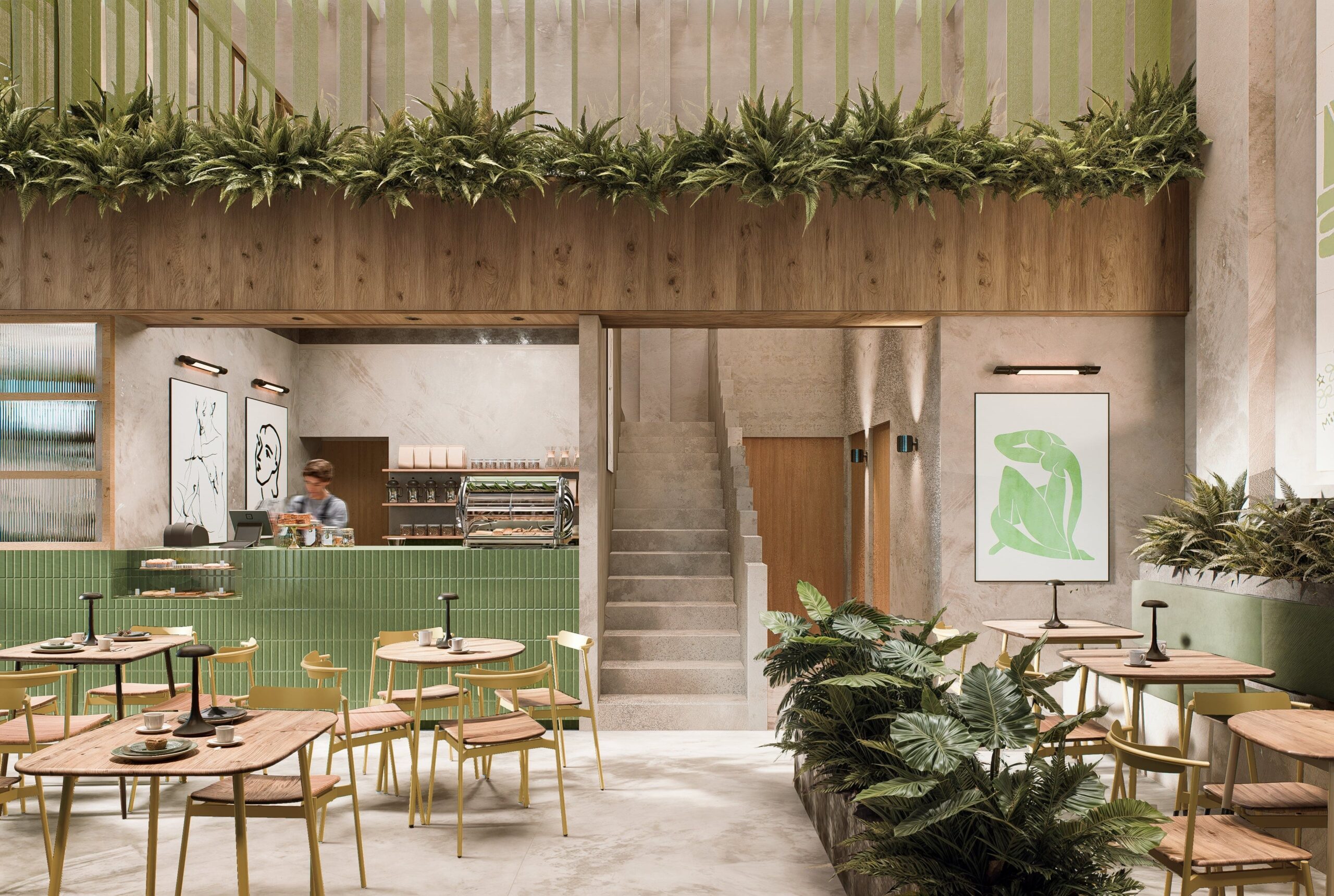 Al ingresar, te reciben cuatro cartelas monolíticas que atraviesan un entrepiso de doble altura, enmarcadas por jardineras colgantes que definen la “Antesala”, un espacio de transición. Al atrevesar|estas cartelas, se accede al “Gran Salón”, un espacio teatral de doble altura con telas verdes que crean un vórtice visual, guiando la mirada hacia un mural monumental y un gran ventanal.