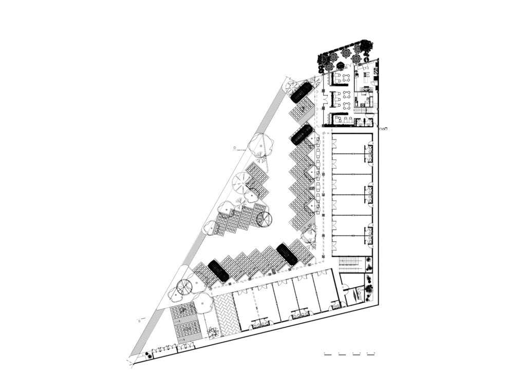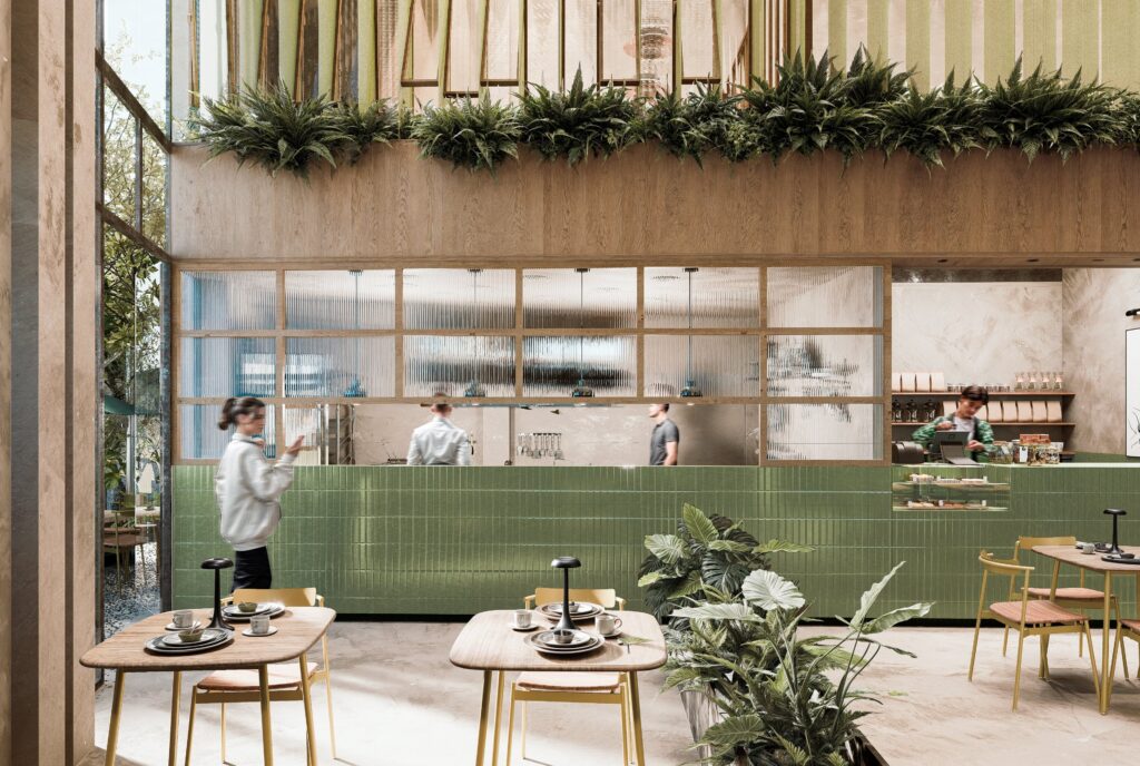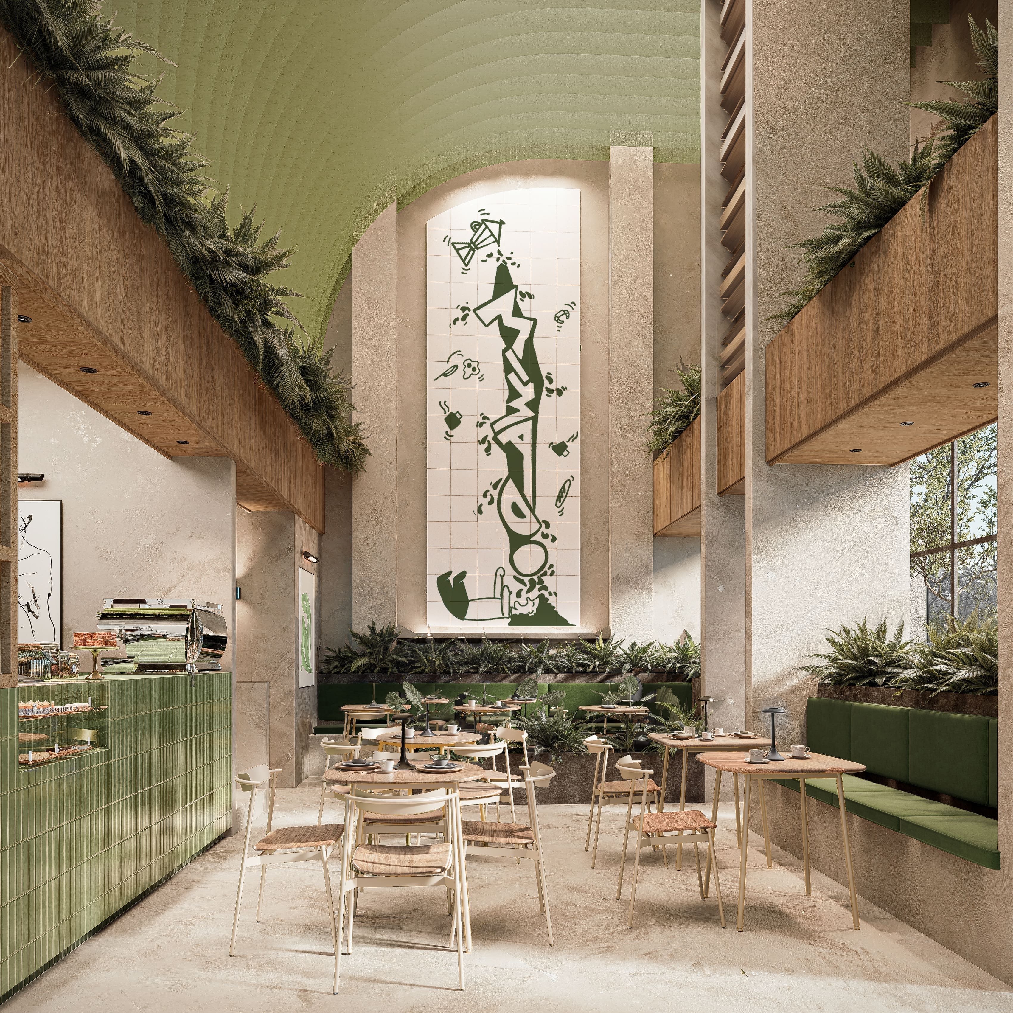 Mural de cerámica, con diseño gráfico cuidadosamente concebido, encapsula el concepto del restaurante, convirtiéndose en el corazón visual/emocional del espacio. Desde la perspectiva superior, la presencia del mural se magnifica, destacando su importancia como símbolo central del lugar.