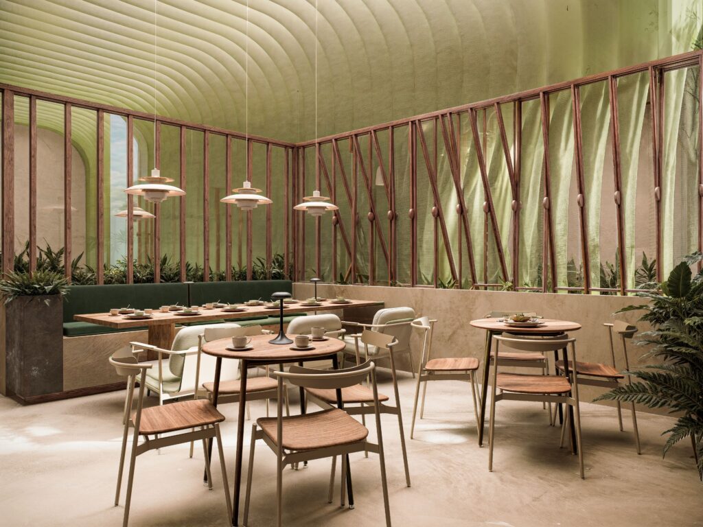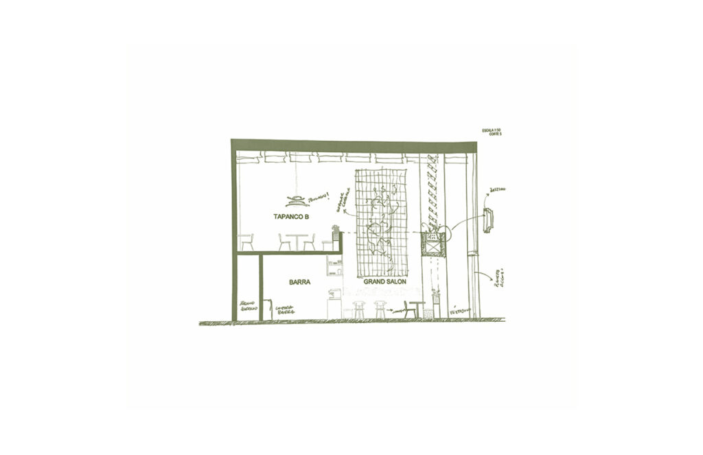 Al cruzar las cartelas, se accede al ¨Gran Salón¨, un espacio de doble altura que recrea la magia de un escenario teatral. Desde el techo, telas verdes caen en curvas suaves, formando un córtice visual que dirige la atención entre dos puntos clave: un gran ventanal en un extremo, y un mural monumental en el otro.